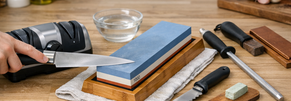 - Knivsliber (elektrisk eller manuel): Praktisk og hurtig løsning for begyndere med indstillelig vinkel. Groft trin til sløve knive og fint trin til afslutning. Passer bedre til europæiske knive end til hårde japanske modeller.